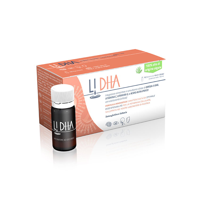 Integratore alimentare in forma di emulsione orale a base di olio algale (omega-3 DHA), vitamine C ed E. È indicato nei casi di aumentato fabbisogno o scarso apporto dalla dieta dell’acido grasso docosaesaenoico omega-3 DHA, fondamentale per la struttura e la funzionalità delle membrane cellulari, in particolare di organi come cervello, retina e cuore. DHA contribuisce: